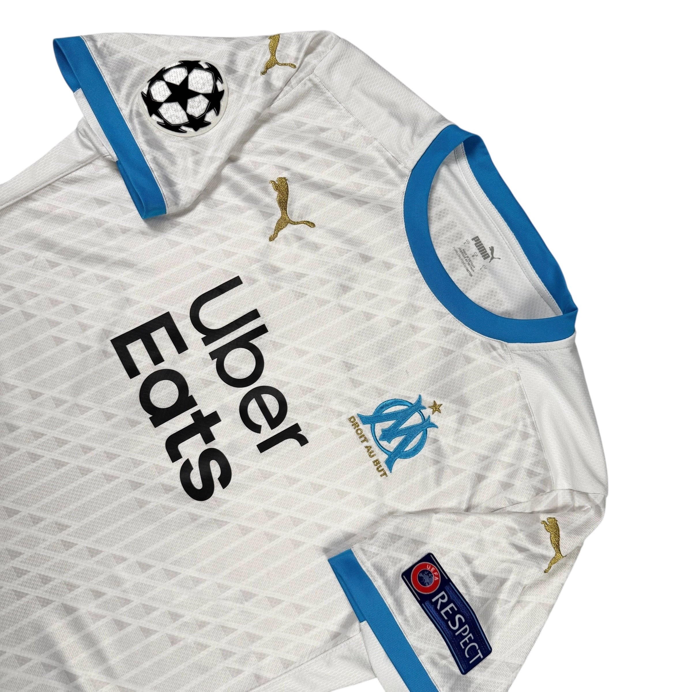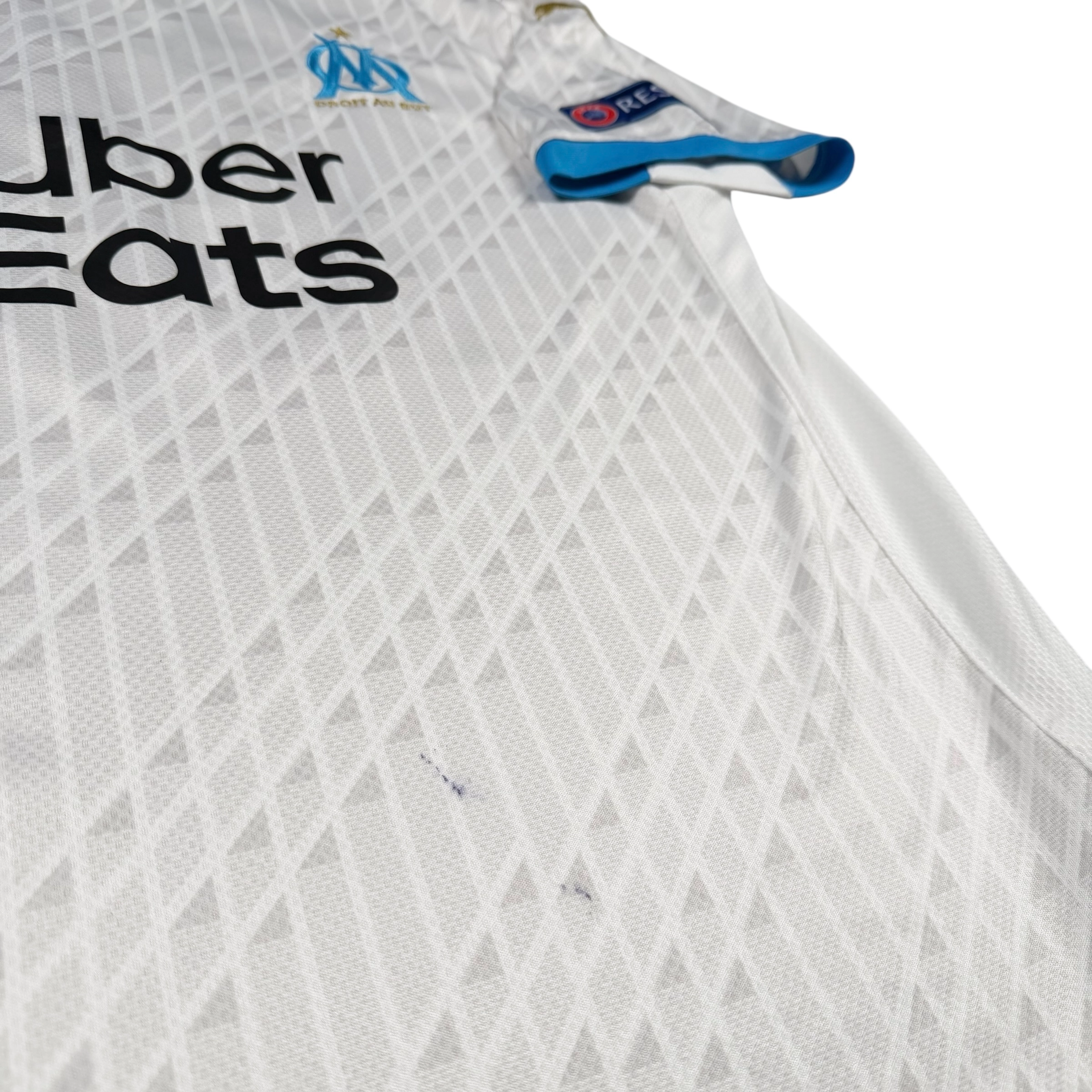 Note IFS : 8/10 – Maillot de l’Olympique de Marseille avec deux traces de bic ou de marqueur sur la face avant, bien visibles mais localisées. Full patchs Ligue des Champions et flocage Europe de Florian Thauvin au dos en super état. Une configuration européenne complète, avec un rendu global propre malgré les marques signalées.