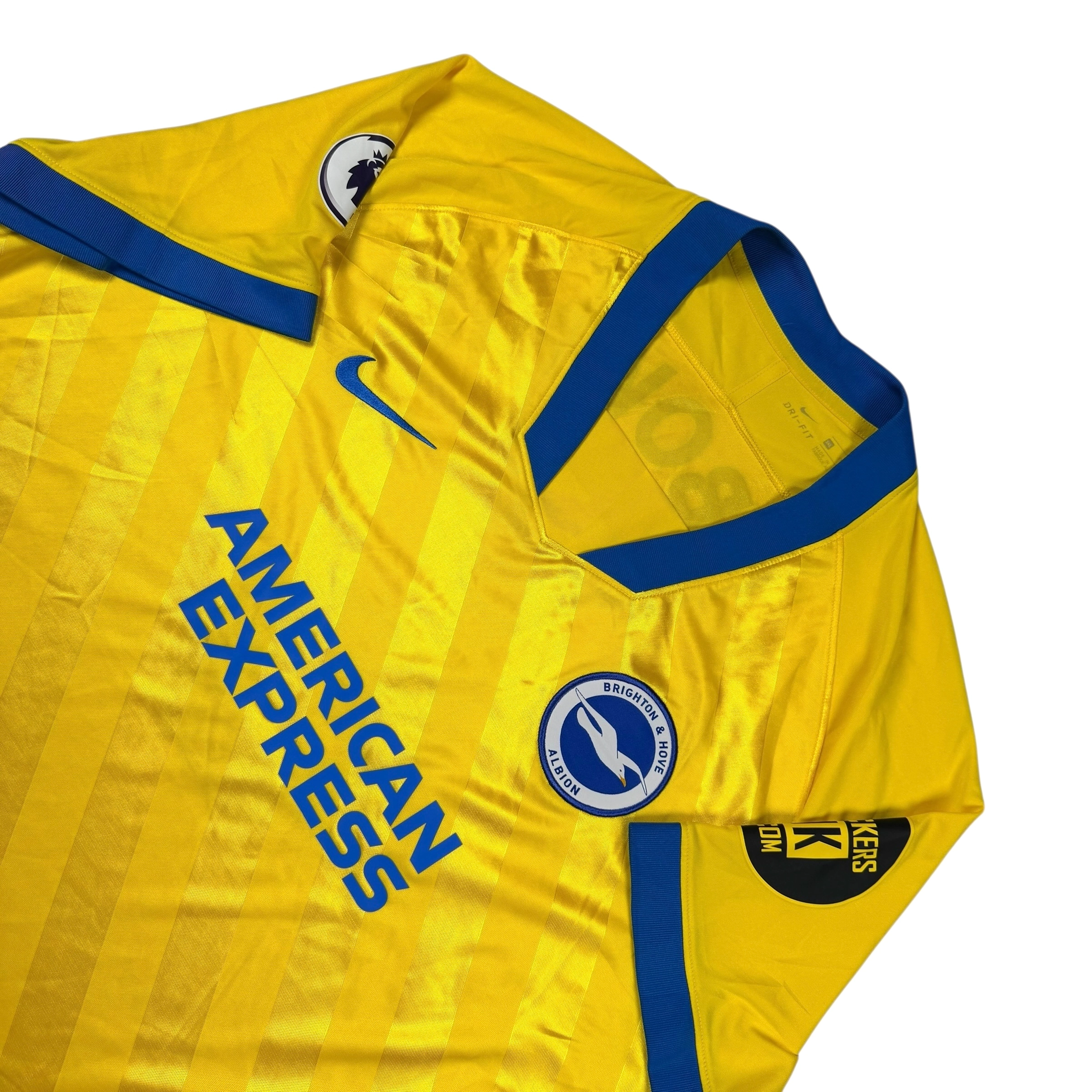 Note IFS : 10/10 – Maillot de Brighton & Hove Albion avec flocage et patch Premier League pour une config full british comme on aime. Gros coup de cœur chez IFS pour ce bicolore ultra réussi : Swoosh Nike bleu assorti au col et aux manches, sponsor bleu lui aussi, franchement aucune faute sur ce modèle. Petite anecdote sympa en bonus : porté comme maillot extérieur en 2020-2021, il devient le third la saison suivante (2021-2022). Deux saisons pour le prix d’une, c’est cadeau.