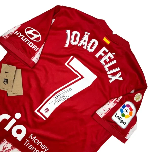 Note IFS : Neuf + étiquettes – Parfaite condition pour ce maillot de l’Atlético floqué Félix et signé par ce dernier. Le logo Nike et l’écusson du club de Madrid sont thermocollés et sont parfaitement conservés.