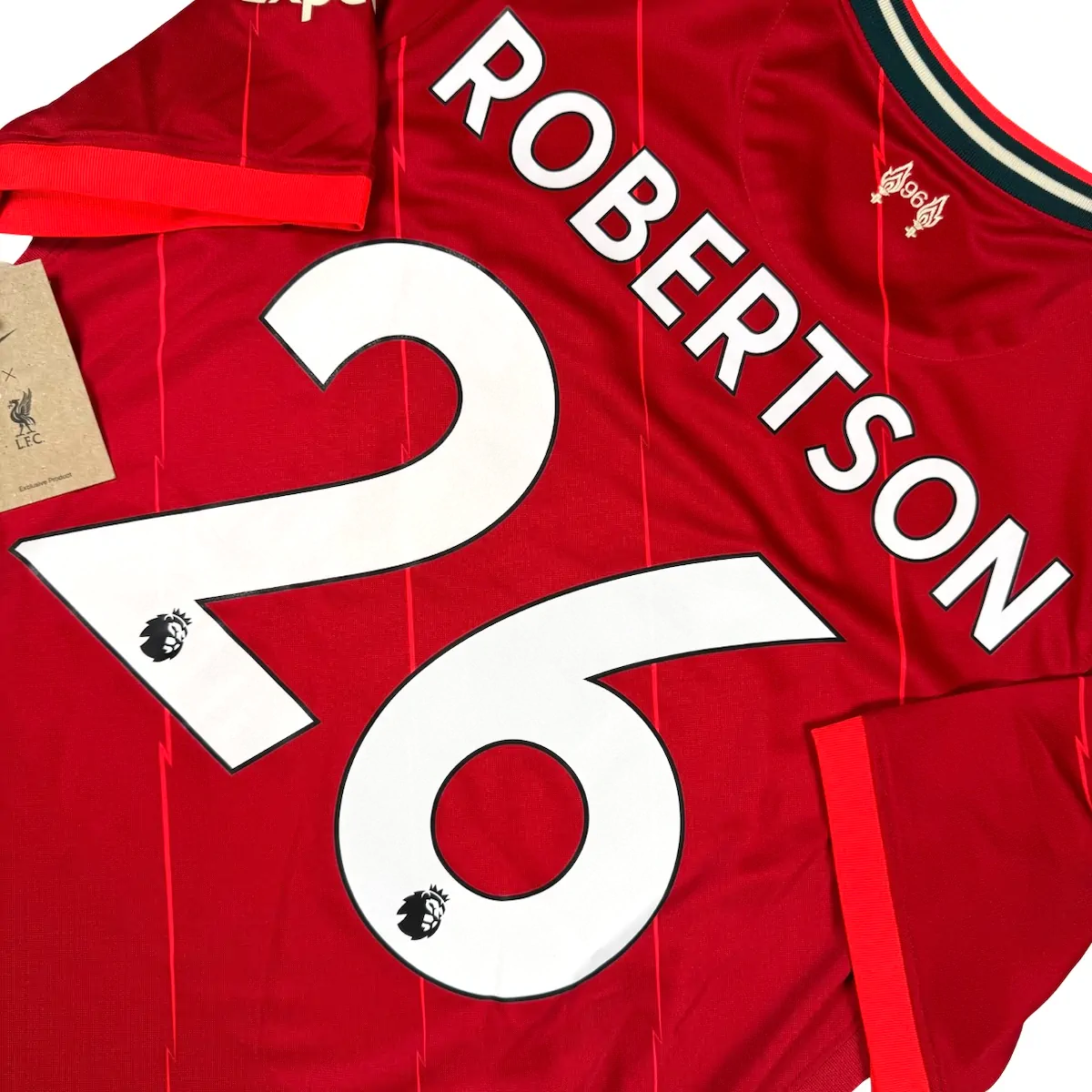 Note IFS : Neuf + étiquettes – Maillot domicile des Reds tout neuf. Flocage officiel version Premier League de Robertson au dos.