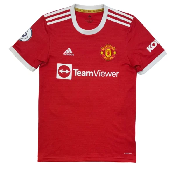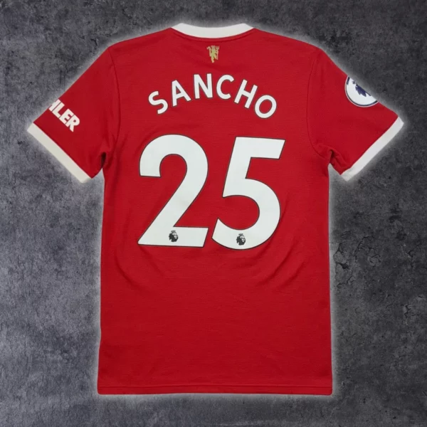 Note IFS : 8/10 – Maillot authentique Adidas en bon état général, quelques bouloches et fils tirés sont à noter (voir photos). Patch Premier League sur la manche. Le flocage officiel de Jadon Sancho est comme neuf !