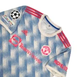 Note IFS : 9/10 – Excellent, le blanc a perdu de son éclat (voir photos). Superbe design par Adidas qui sort des sentiers battus, on voit clairement l’inspiration tirée du fameux « Snowflakes » de 90-92 ! Il s’agit du flocage version coupe (FA Cup et Champions League).