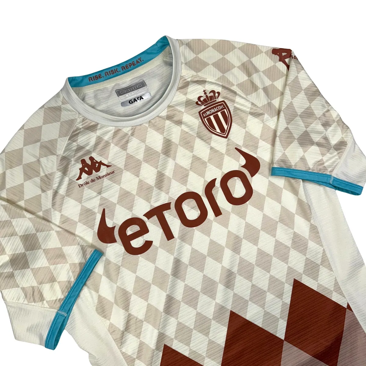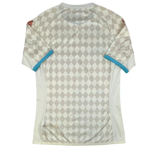 Note IFS : 10/10 – Maillot player en parfaite condition, avec une coupe ajustée. L’AS Monaco s’associe à la marque Drôle de Monsieur et à Kappa pour une collaboration exclusive, fusionnant mode et football. Inspiré des armoiries monégasques, ce quatrième maillot arbore un motif losange dans des tons ivoire, caramel et bleu azur, reflétant le style et l’élégance de la Côte d’Azur. Édition très limitée, il n’a été porté qu’une seule fois en match, lors de la rencontre face au LOSC Lille le 23 octobre 2022. Maillot rare et recherché !