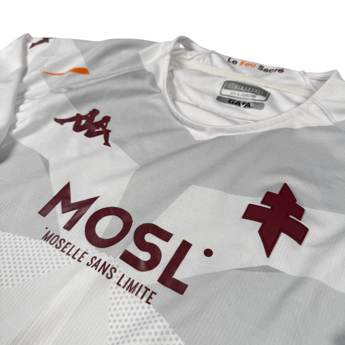 Note IFS : 8/10 – Maillot du FC Metz avec quelques bouloches à signaler ainsi qu’un sponsor abîmé. Défauts visibles et pris en compte, mais le maillot reste authentique et totalement portable, idéal pour ceux qui préfèrent une pièce qui a vécu plutôt qu’un rendu trop neuf.