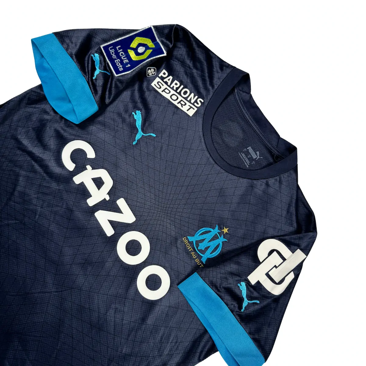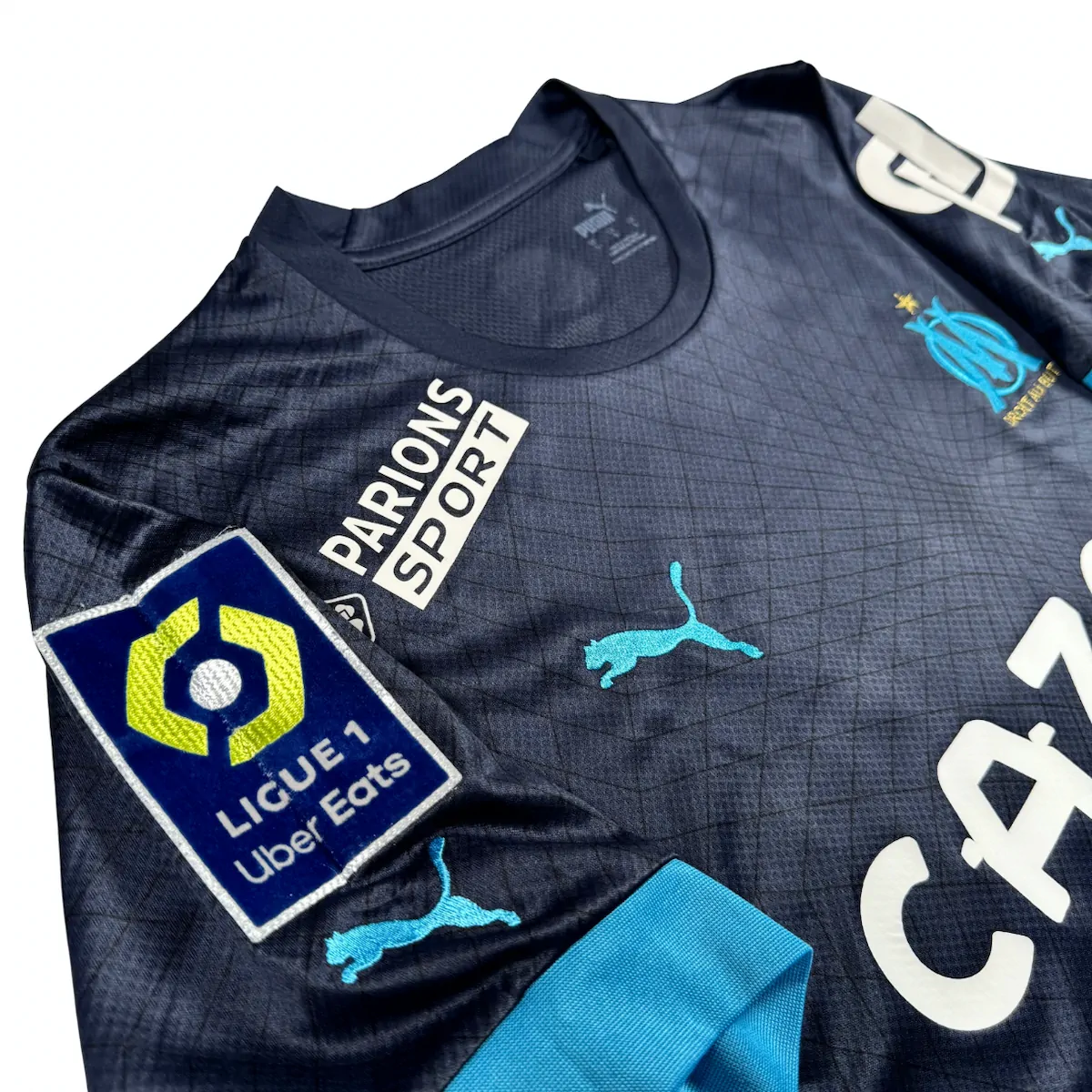 Note IFS : 9/10 – Excellent état. Ce maillot de l’OM full sponsors (D’or et platine de Jul) est floqué. Le patch officiel de la Ligue 1 Uber Eats est présent sur la manche. Certains sponsors sont très légèrement craquelés, rien de bien méchant.