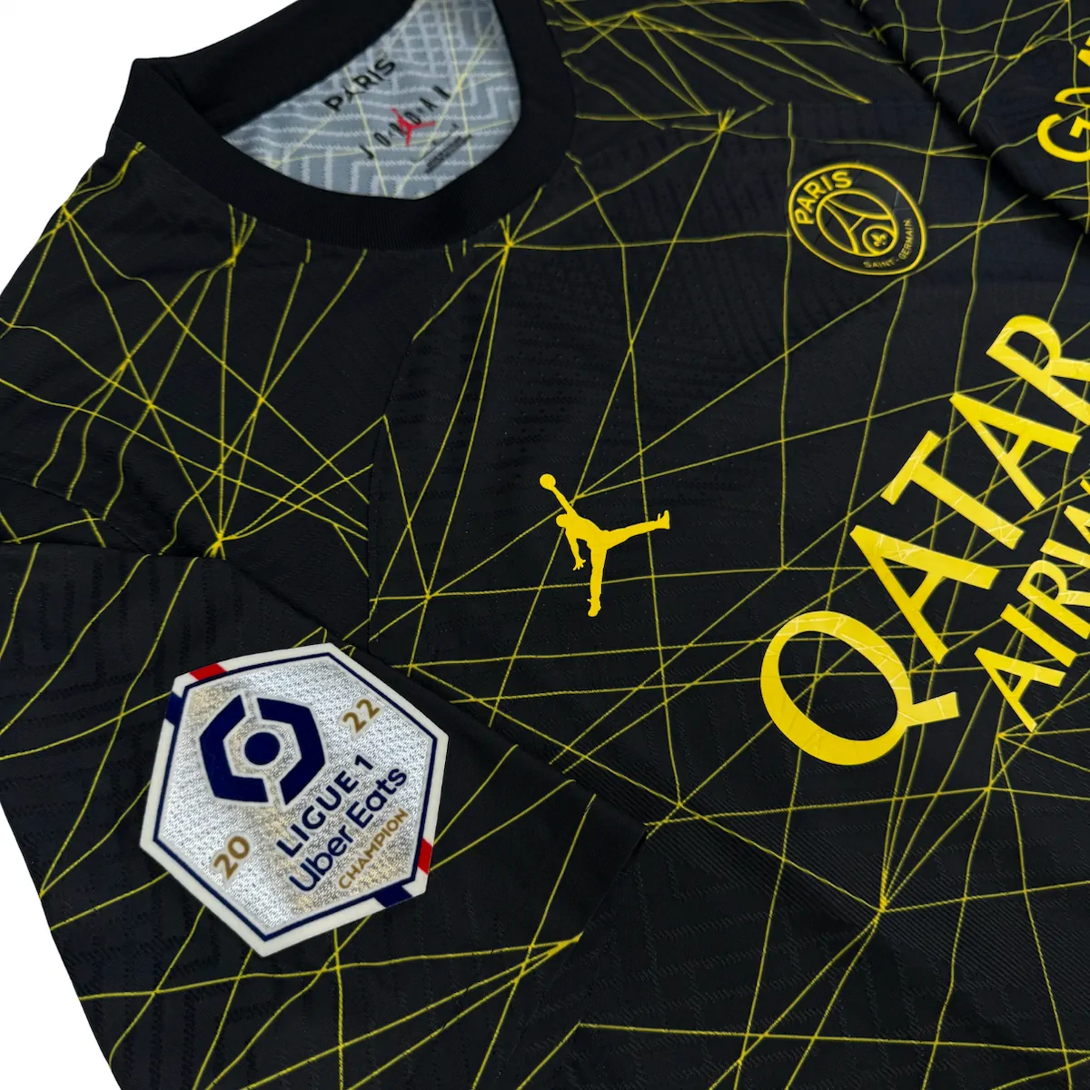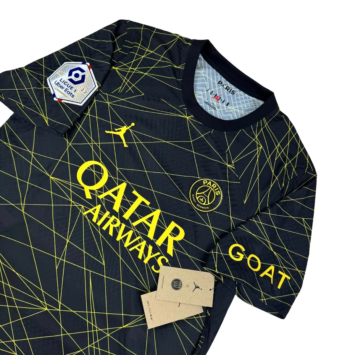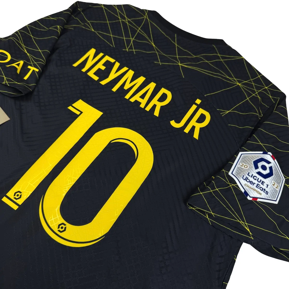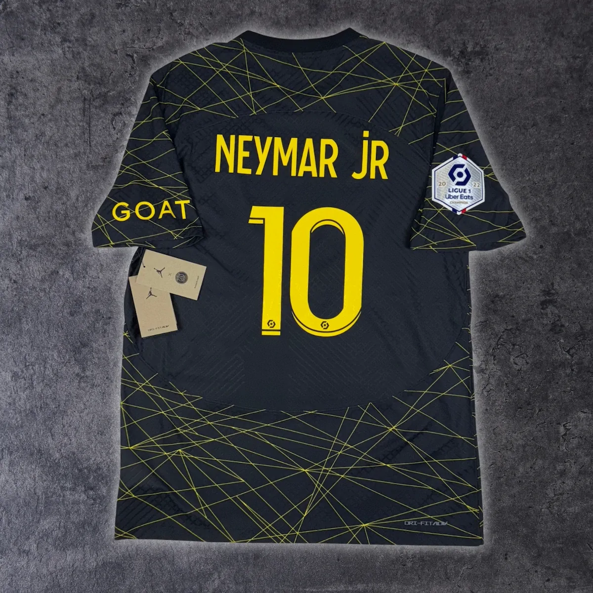Note IFS : Neuf + étiquettes – Sublime quatrième maillot authentique du PSG floqué de Neymar. Tout neuf avec ses étiquettes et en version Player (taille plus fit, tissu respirant, logos thermocollés). Le design s’inspire de la Tour Eiffel: les faisceaux jaunes sur la tenue évoquent les poutres illuminées de la Tour Eiffel, un symbole emblématique du club. Le badge officiel de la Ligue 1 apporte un petit + !