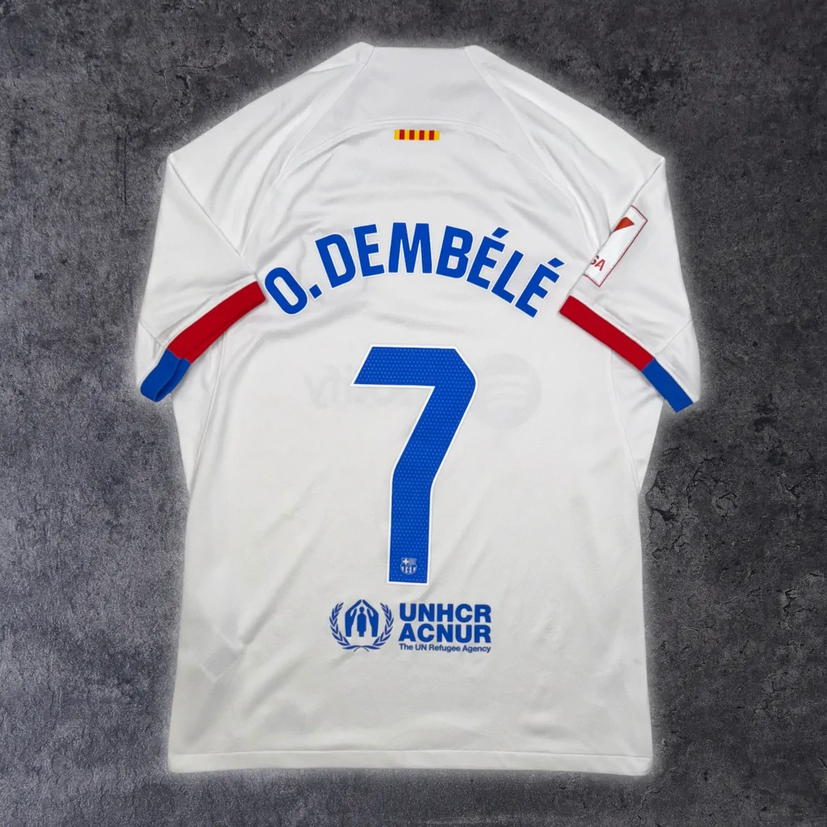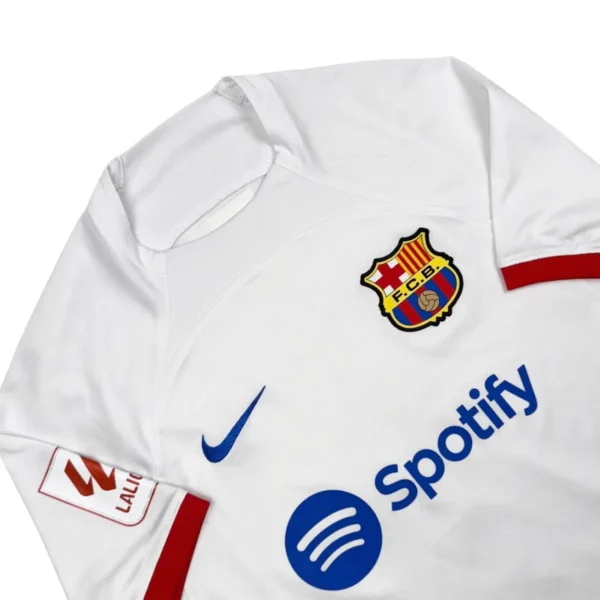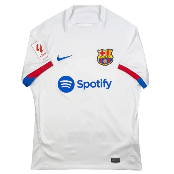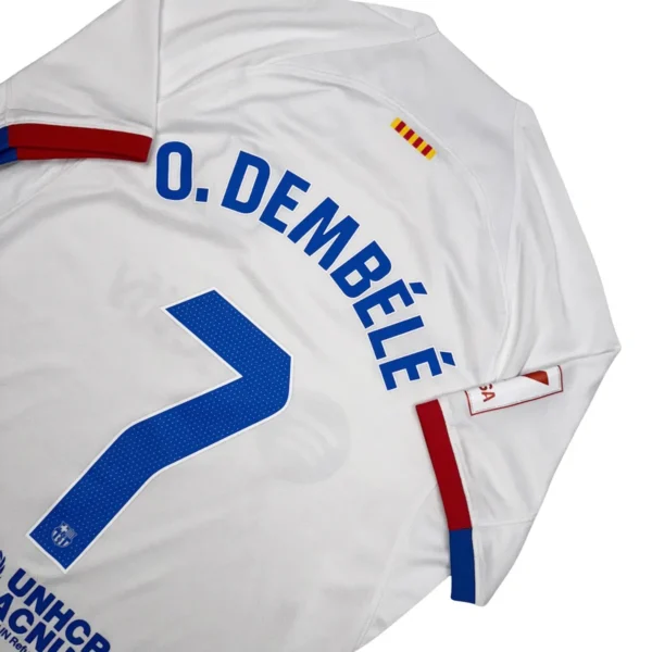 Note IFS : 10/10 – Maillot du Barça en parfaite condition, avec le patch officiel La Liga sur la manche. Design sobre mais ultra efficace, sublimé par un magnifique flocage bleu de Dembélé. Une pièce moderne, classe et impeccable.