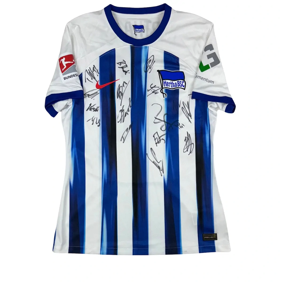 Note IFS : 9/10 – Excellent. Maillot version pro issu du stock du club lors d’un match amical contre le Standard de Liège en pré-saison. Ce maillot est signé par une partie de l’effectif du Hertha Berlin et était préparé pour la rencontre (aucun numéro 46 n’est entré en jeu lors de ce match). Idéal pour la collection !