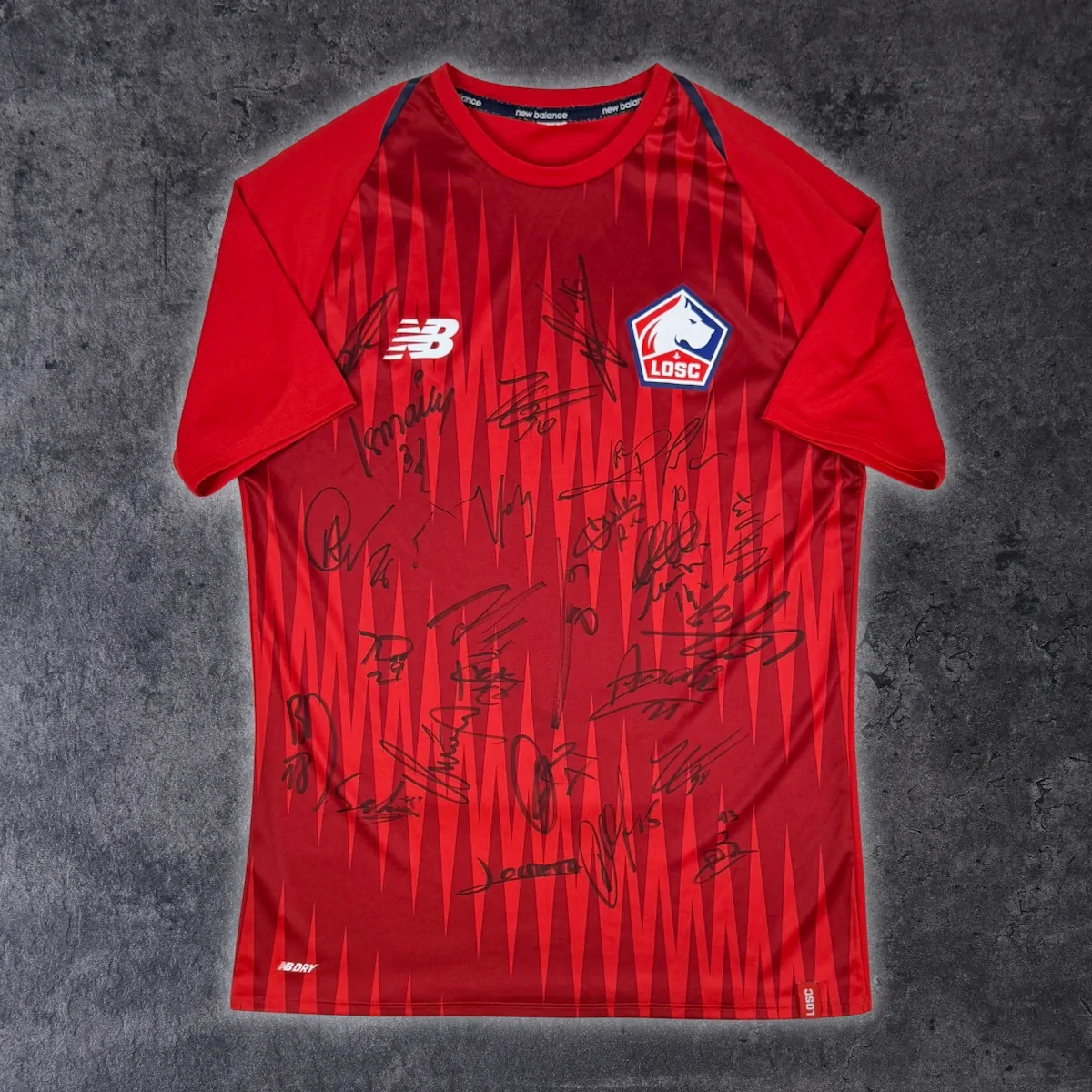 Note IFS : 10/10 – Parfait. Maillot d’entrainement du LOSC signé par une grosse partie de l’équipe ! On reconnait facilement le signatures de Lucas Chevalier, Thomas Meunier, Cabella et Ismaily ! Á encadrer ou à coffrer bien au chaud dans sa collection. Le maillot nous provient d’une source sûre.