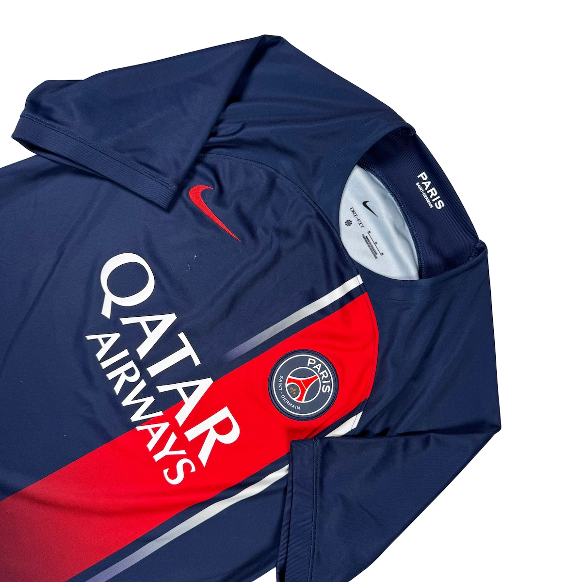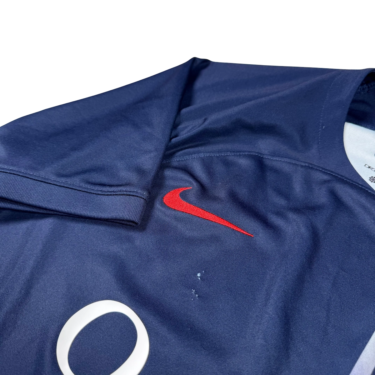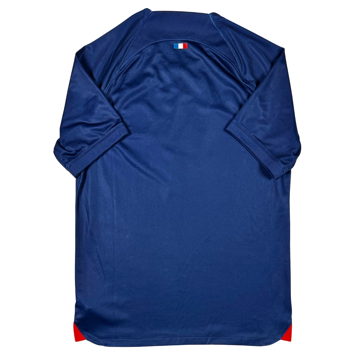 Note IFS : 7/10 – Maillot récent du PSG avec un vécu bien visible, quelques accrocs et petits trous près du logo Nike à signaler. Clairement le genre de maillot idéal pour s’arracher à l’entraînement sans prise de tête. Et comme on aime le rappeler chez IFS, un vrai maillot authentique abîmé vaut toujours mieux qu’un fake en parfait état.