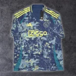 Note IFS : Neuf + étiquettes – Extérieur 2024/25 de l’Ajax signé adidas, base bleu avec détails jaune fluo qui claquent. Motifs abstraits inspirés de l’art d’Amsterdam et clin d’œil à Van Gogh. Les trois croix de Saint-André au dos du col rappellent fièrement la ville. Un design original et marquant, impossible à louper dans la rue. Un maillot ou une oeuvre d’art ?