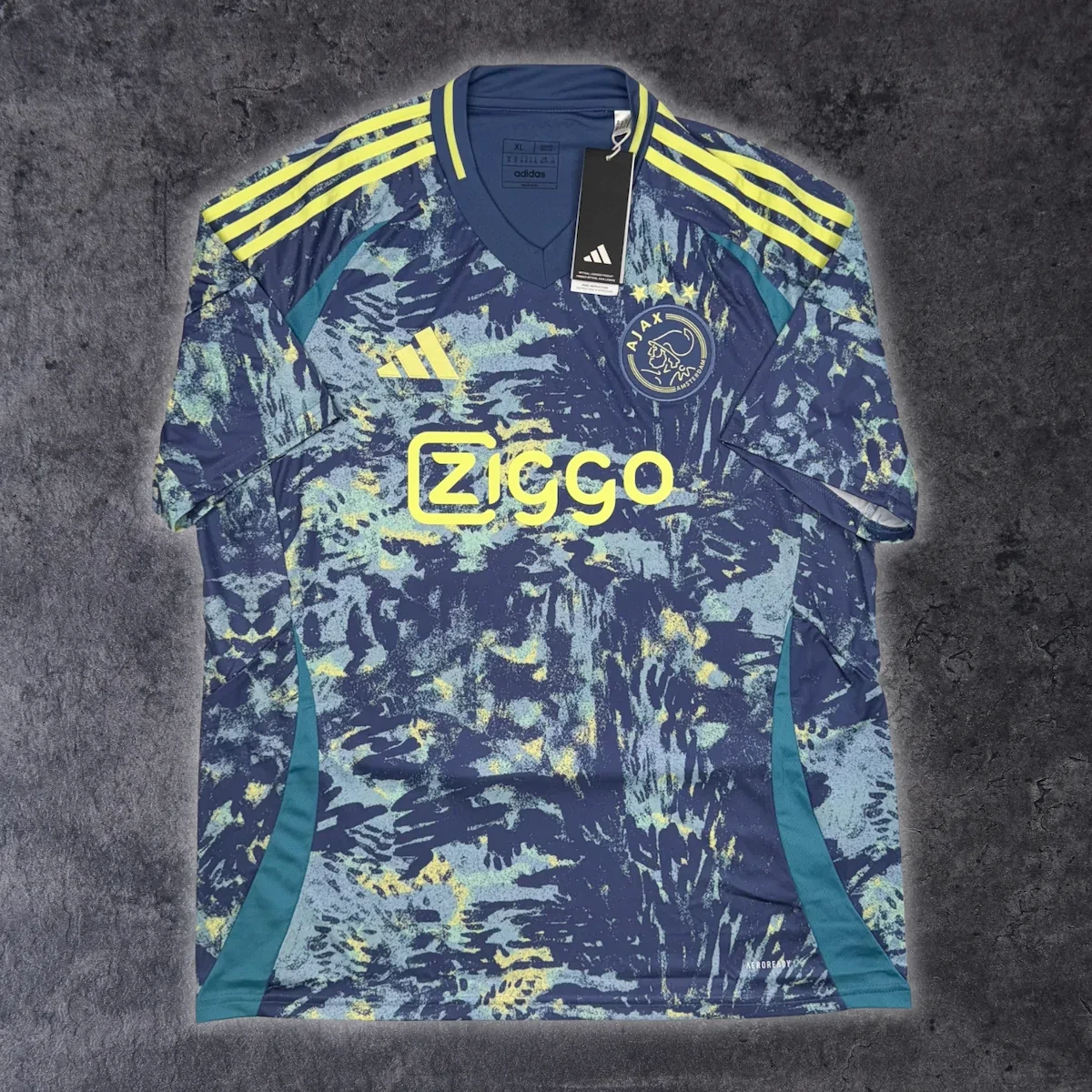 Note IFS : Neuf + étiquettes – Extérieur 2024/25 de l’Ajax signé adidas, base bleu avec détails jaune fluo qui claquent. Motifs abstraits inspirés de l’art d’Amsterdam et clin d’œil à Van Gogh. Les trois croix de Saint-André au dos du col rappellent fièrement la ville. Un design original et marquant, impossible à louper dans la rue. Un maillot ou une oeuvre d’art ?