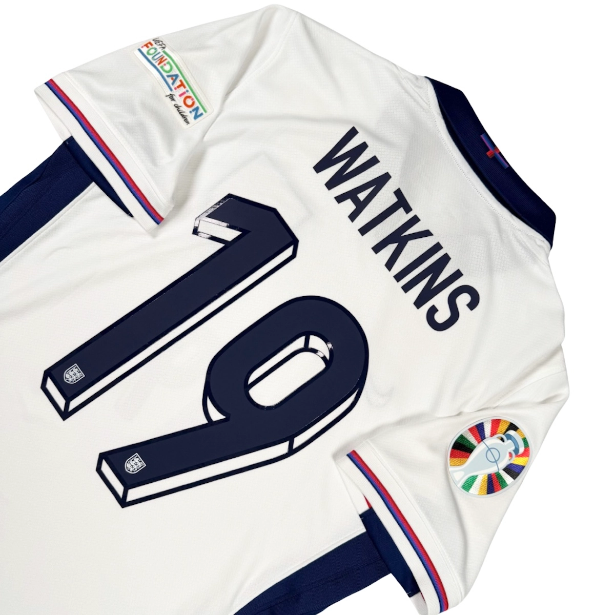 Note IFS : 9/10 – Maillot domicile de l’Angleterre avec le flocage officiel d’Ollie Watkins au dos, une toute petite trace à signaler sur le flocage à l’avant, sinon le reste est impeccable. Flocage rare qu’on ne croise pas tous les jours, loin des choix ultra mainstream type Bellingham, et c’est justement ça qu’on aime chez IFS : des joueurs différents, des pièces qui sortent du lot. Pour couronner le tout, présence du patch Euro 2024 et de l’inscription du match de la finale sous le blason, une config’ complète et très stylée pour les vrais amateurs.
