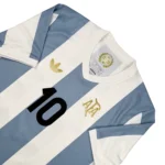 Note IFS : 9/10 – L’Argentine et Adidas ont sorti en novembre 2024 un maillot anniversaire pour fêter leurs 50 ans de collaboration. Design rétro avec rayures bleu ciel et blanc, logo trèfle doré, écusson style années 70 avec les trois étoiles. Il a fait ses débuts en match officiel face au Pérou le 20 novembre 2024. Floqué de l’un des meilleurs joueurs de tous les temps, ce maillot prendra encore de la valeur à coup sûr ! Léo Messi…