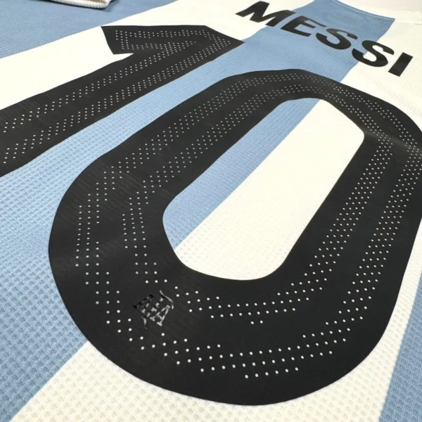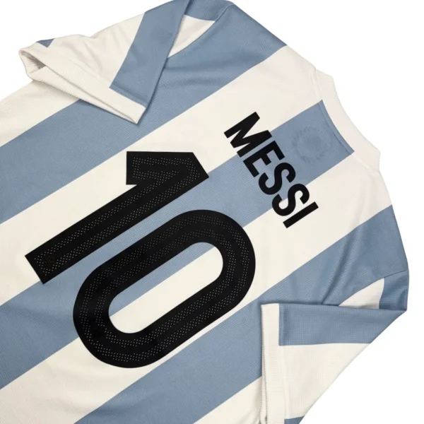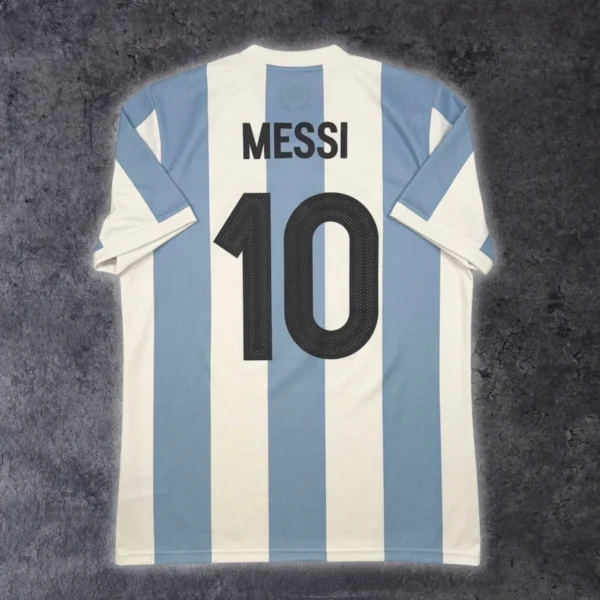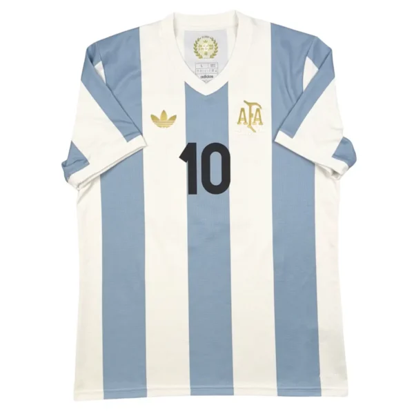 Note IFS : 9/10 – L’Argentine et Adidas ont sorti en novembre 2024 un maillot anniversaire pour fêter leurs 50 ans de collaboration. Design rétro avec rayures bleu ciel et blanc, logo trèfle doré, écusson style années 70 avec les trois étoiles. Il a fait ses débuts en match officiel face au Pérou le 20 novembre 2024. Floqué de l’un des meilleurs joueurs de tous les temps, ce maillot prendra encore de la valeur à coup sûr ! Léo Messi…