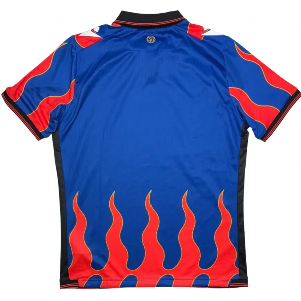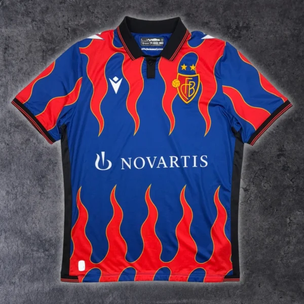 Note IFS : 10/10 – Ce maillot du FC Bâle, signé Macron, rend hommage à la ville avec un design inspiré du drapeau : flammes rouges sur fond bleu, basilic en relief dans le tissu, et détails dorés évoquant les œufs de la créature mythique. À l’intérieur du col, on retrouve le message « Brenne für den FCB »(« Brûle pour le FCB », c’est une expression symbolique qui veut dire : mouille le maillot). Un maillot qui mixe parfaitement tradition locale et style moderne. Un régal visuel !