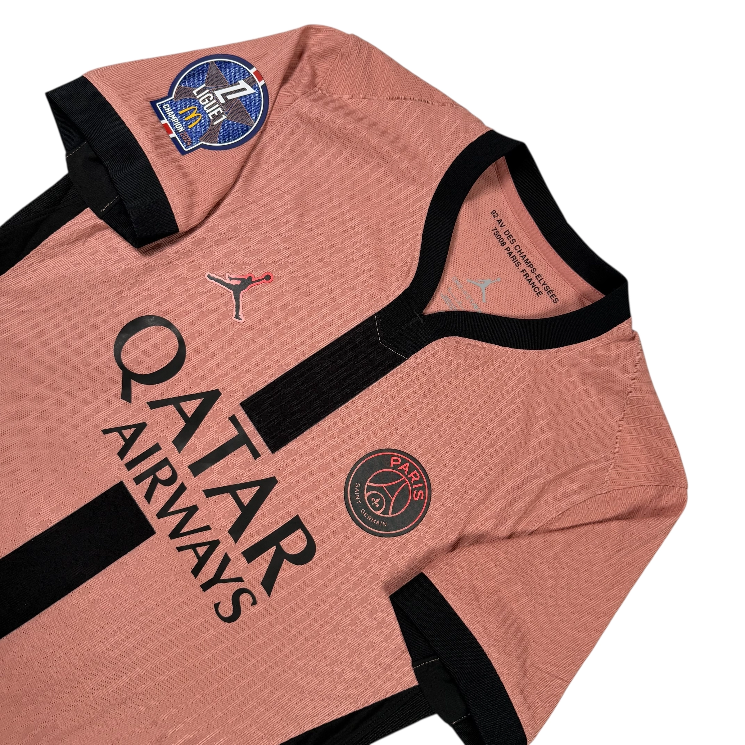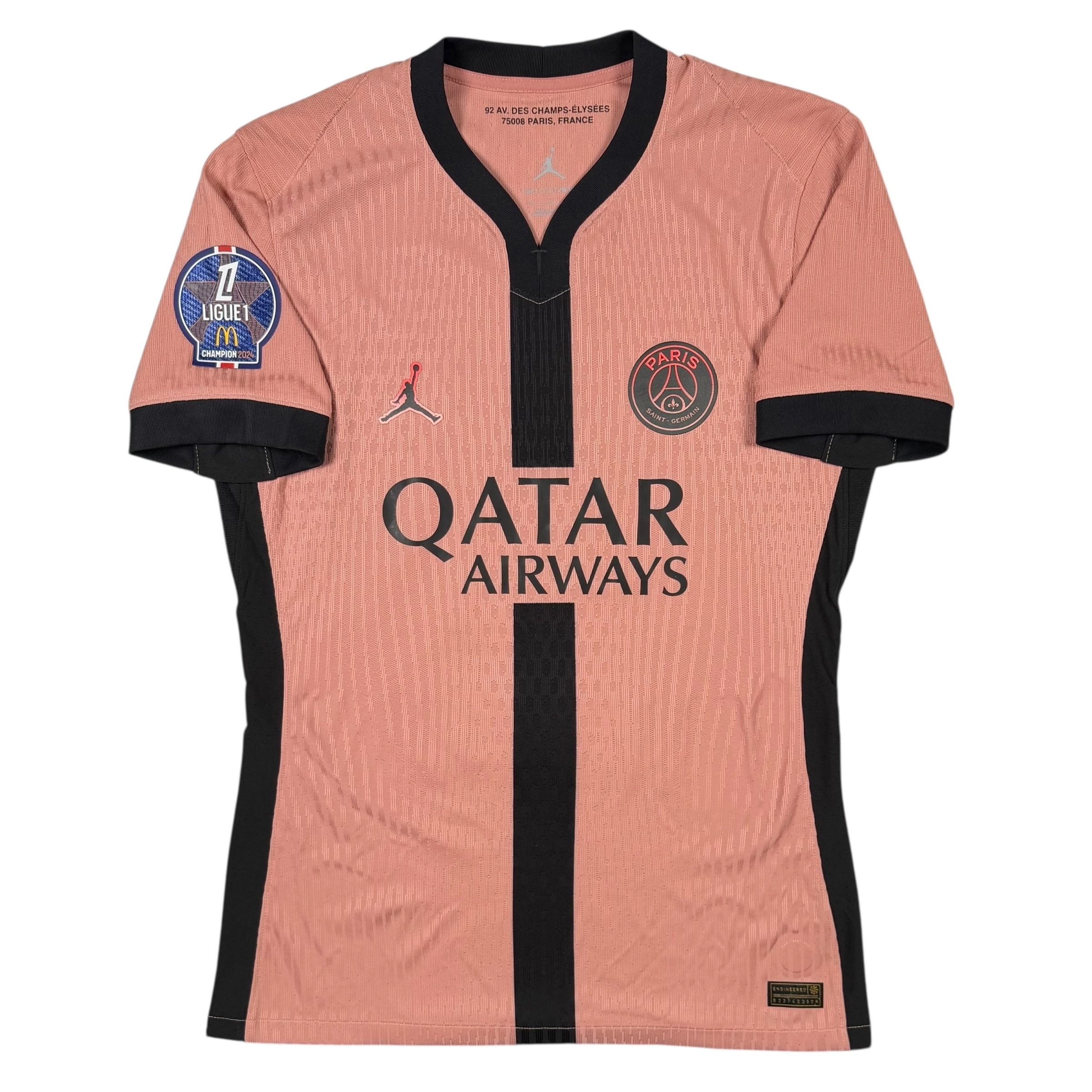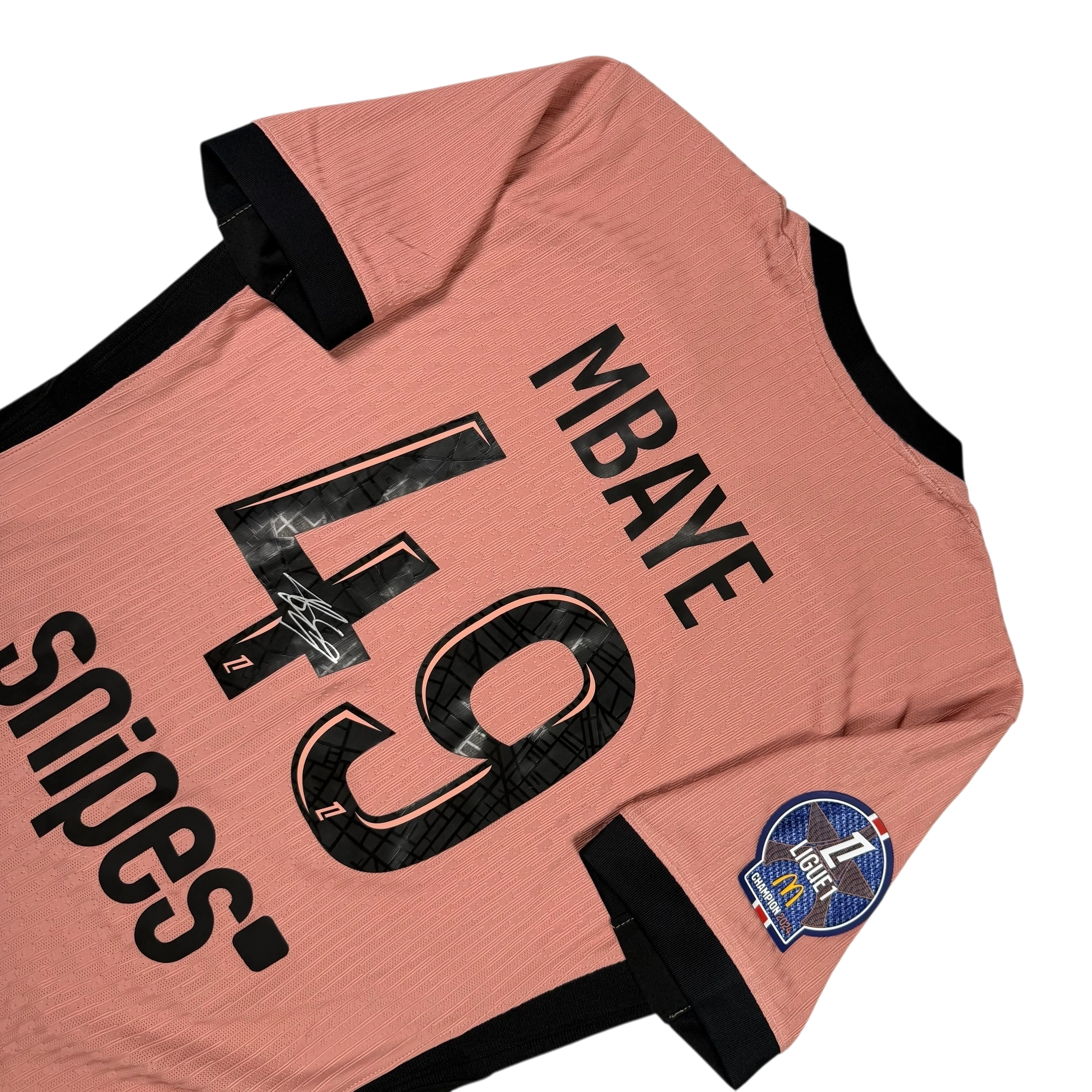 Note IFS : 9/10 – Maillot du Paris Saint-Germain très rare et pas simple à choper, avec puce Fabricks. Tu approches le téléphone et, via la technologie NFC, tu as les infos liées au match. On est sur un vrai maillot pro préparé ET signé, avec une coupe hyper cintrée et la taille de Ibrahim Mbaye, donc rien à voir avec une version boutique. Maillot préparé pour le match à l’extérieur contre le FC Nantes le 22 avril 2025, annoncé comme non porté. Il peut malgré tout présenter quelques micro traces, car il a peut-être été utilisé à l’échauffement. Depuis, Mbaye à remporté la Ligue des Champions et la CAN, pas mal non ? On est peut-être sur un maillot/placement qui va grimper si sa carrière explose…
