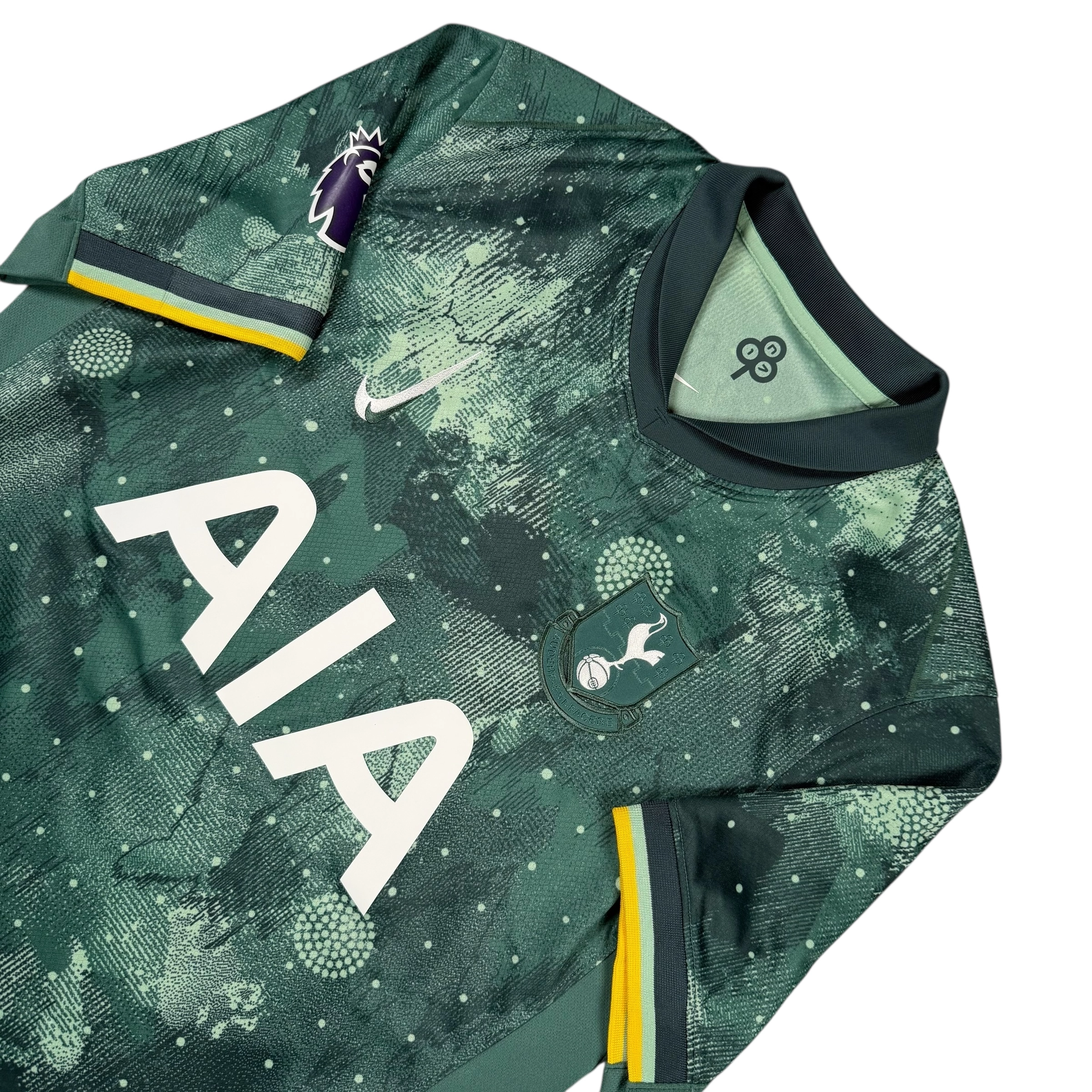 Note IFS : 9/10 – Maillot Third (troisième) de Tottenham dans un excellent état ! Flocage de Son et patch Premier League pour couronner le tout. Le design s’inspire des Seven Sisters, ancien groupe de sept arbres plantés dans le quartier de Tottenham, devenu un symbole local, dont les motifs et l’esthétique servent de base au design de cette pépite. IFS à votre service !