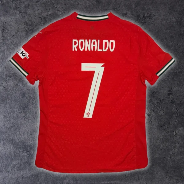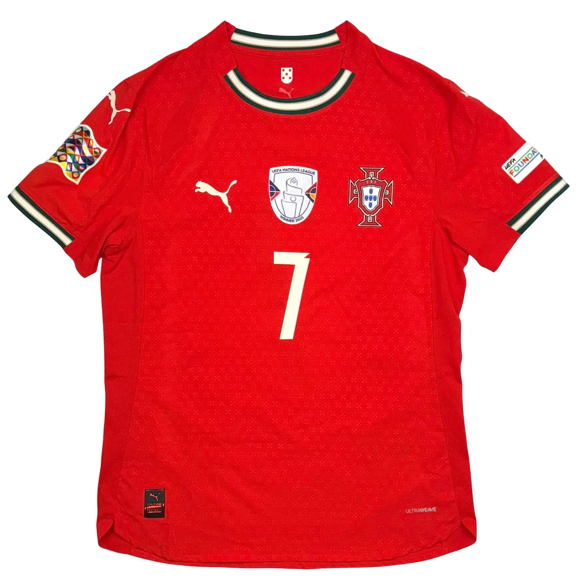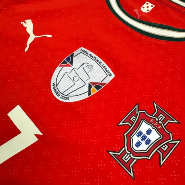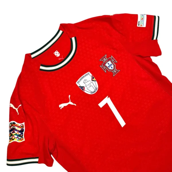 Note IFS : 10/10 – Maillot du Portugal signé Puma, le tout premier de la sélection avec cet équipementier. Version pro UltraWeave, identique à celle portée par les joueurs. Il est full patchs : badge de vainqueur de la Ligue des Nations sur le torse, patch Nations League sur les manches, et le flocage CR7 dans le dos. Une pièce ultra complète, full options, comme on en voit rarement.
