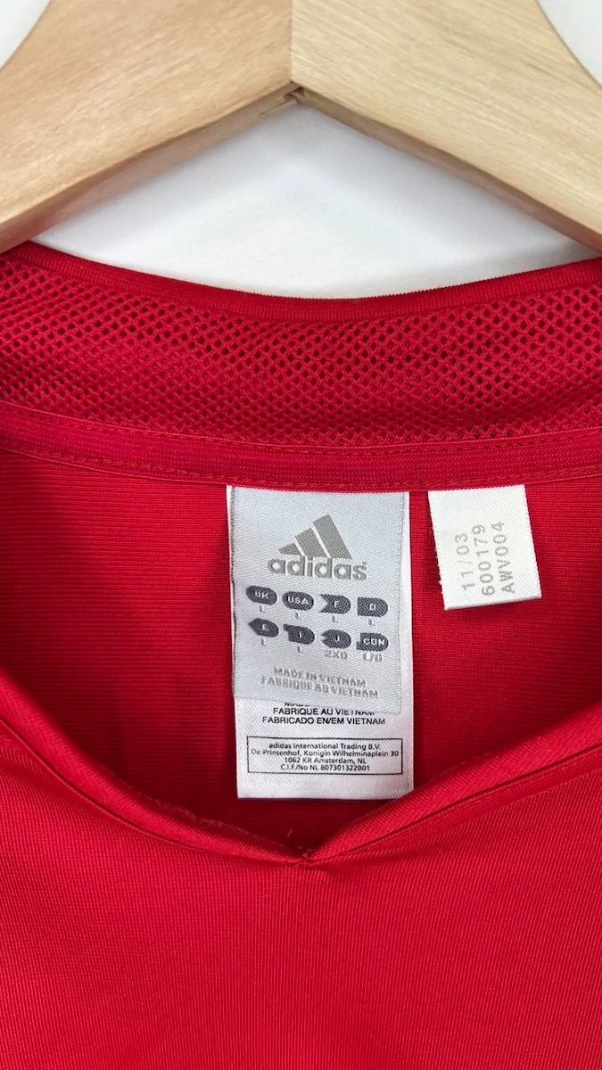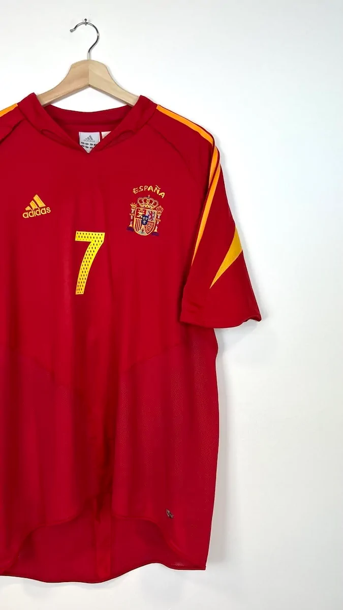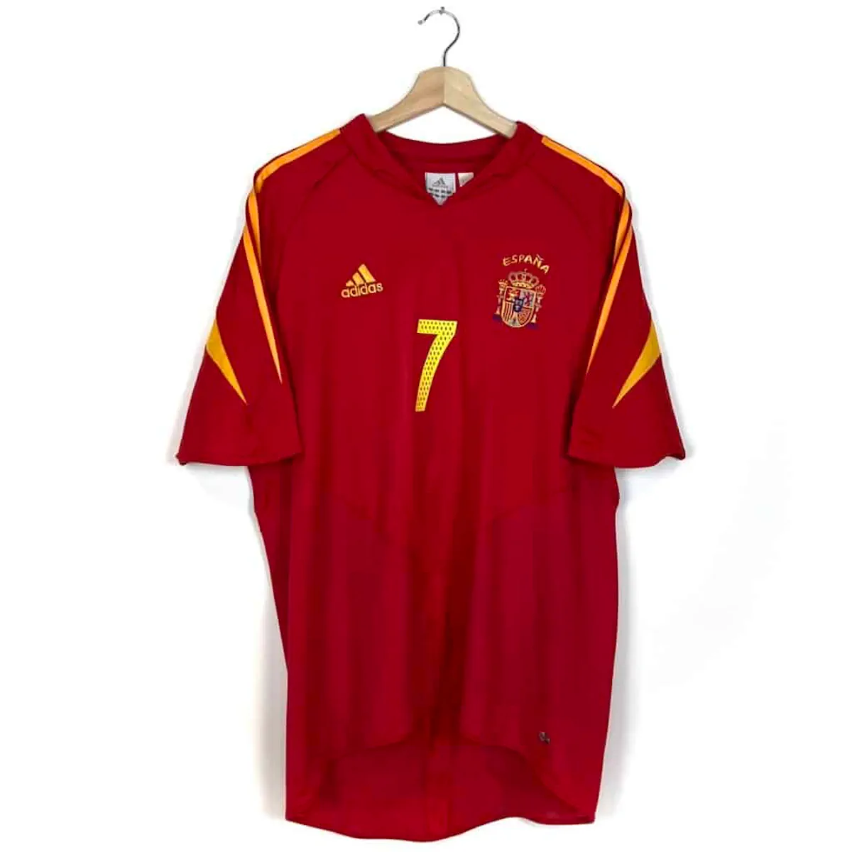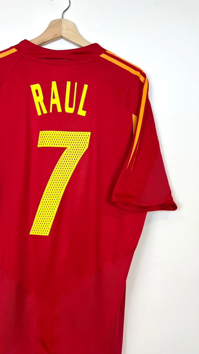 Note IFS : 9/10 – Excellent état général pour ce maillot Iconic ! Ce magnifique maillot de Raul n’a pratiquement aucun défaut si ce n’est le « Climacool » qui est légèrement effacé (voir photos). Les maillots Adidas de 2004 avaient pour beaucoup d’entres eux le même design que ce maillot de la Roja, on appelle ça dans notre domaine le « template » ! Floqué du mythique attaquant Raul Gonzalez et son célèbre numéro 7, ce maillot est une véritable pépite !