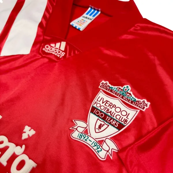 Maillot centenaire du club (1892-1992) en parfaite condition, pièce ultra rare pour tout fan des Reds. Sous les ordres de Graeme Souness, Liverpool boucle la saison sans titre malgré les 22 buts de Ian Rush. 6ème place en championnat, avec un effectif où l’on retrouve aussi Jamie Redknapp. Collector.