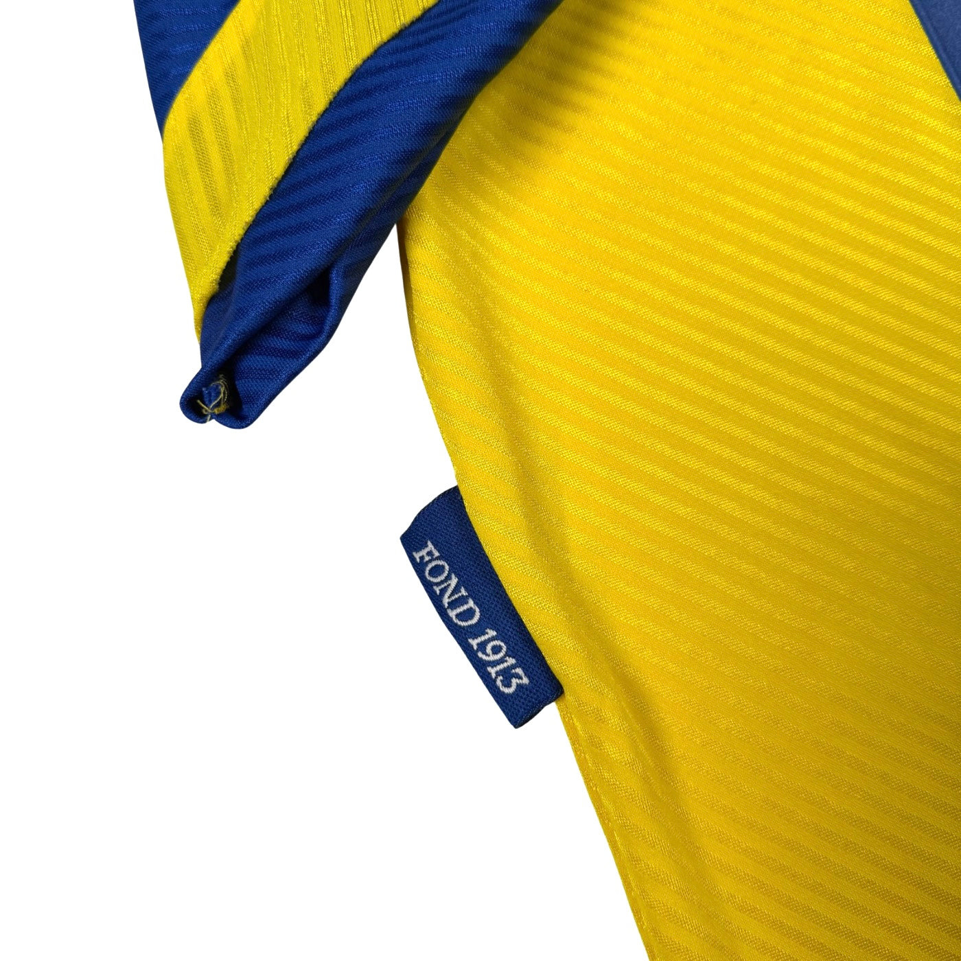 Note IFS : 8/10 - Maillot rétro de Parme en très bon état général avec un seul vrai défaut : la manche droite est décousue (voir photo). Du coup on l’a mis moins cher qu’un exemplaire en parfait état. Si tu as une tante qui sait manier l’aiguille et le fil, c'est le moment de l'appeler, la valeur du maillot peut remonter instantanément. Les lacets d’époque sont toujours présents, ce qui est assez rare sur ce modèle. En parfaite condition, une pièce comme ça tournerait facilement autour des 150 € vu sa rareté et son authenticité.