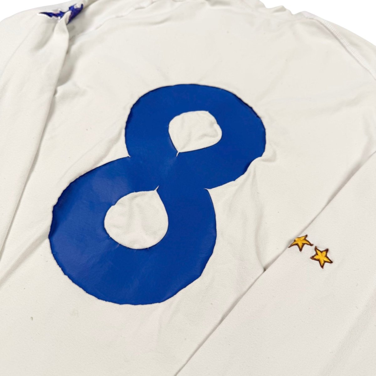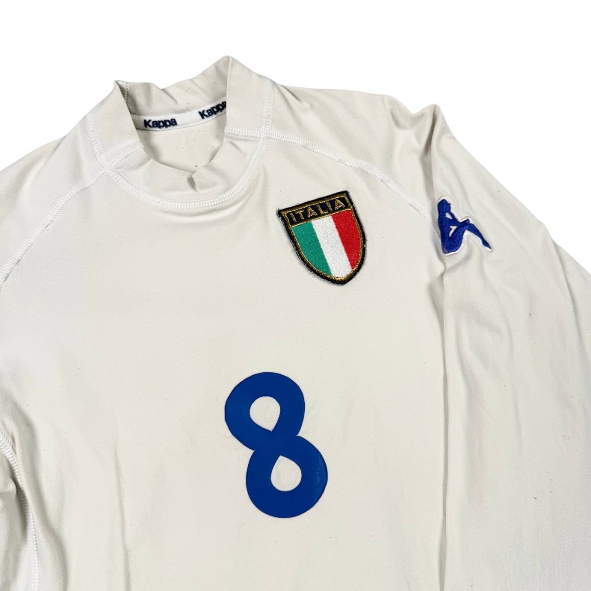 Maillot extérieur de l’Italie avec une usure marquée au niveau des flocages et du textile, traces du temps bien visibles. Version rare en manches longues, vraie pièce vintage de la Squadra Azzurra.