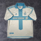 Note IFS : 8/10 – Maillot de l’OM en très bon état général avec seulement quelques petites traces visibles si on regarde de près. Le sponsor Ericsson en feutrine est superbement conservé et les logos Adidas ainsi que l’écusson sont brodés comme neufs. Un superbe maillot vintage signé Adidas avec ce légendaire sponsor Ericsson en feutrine, tout simplement Iconic.