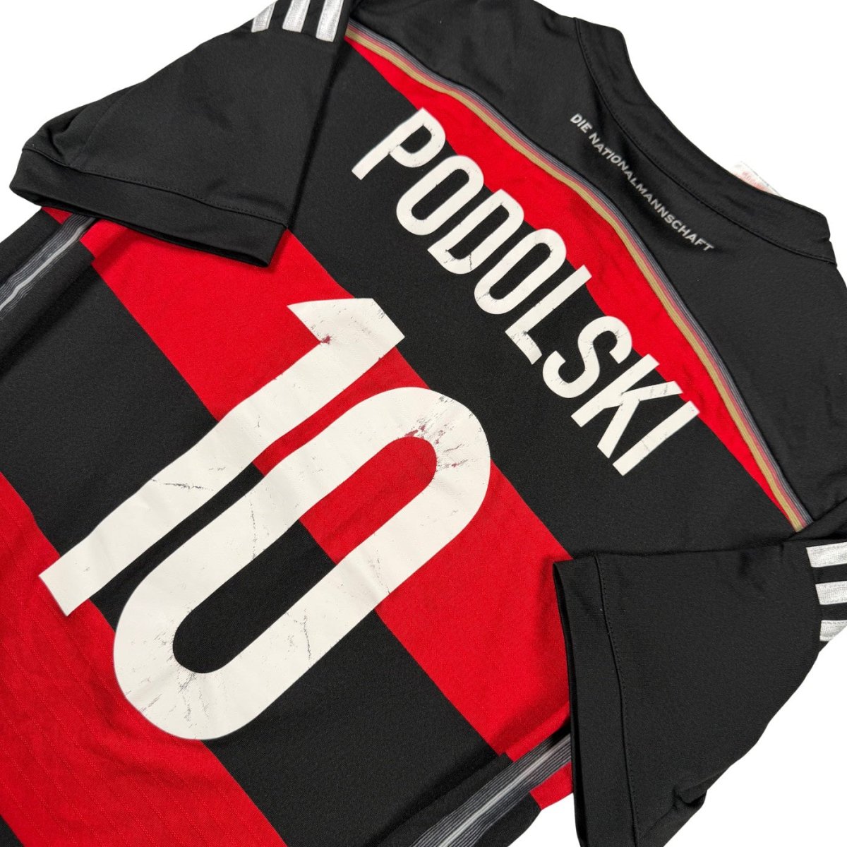 Maillot de l’Allemagne floqué Podolski, flocage légèrement marqué par l’usure, taille 10-12 ans, une pièce sympa malgré les traces du temps.