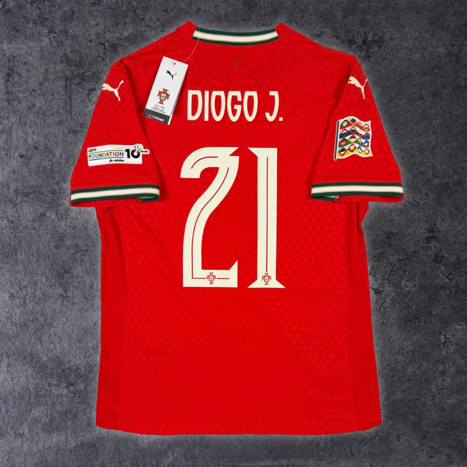 Note IFS : Neuf + étiquettes - Maillot du Portugal en version Pro UltraWeave par Puma, textile très fin et léger conçu pour la performance, logos et finitions thermocollés, patchs UEFA Nations League Winners 2025, un maillot complet et haut de gamme en hommage à Diogo Jota de Liverpool, une pièce premium aussi belle à porter qu’à collectionner.
