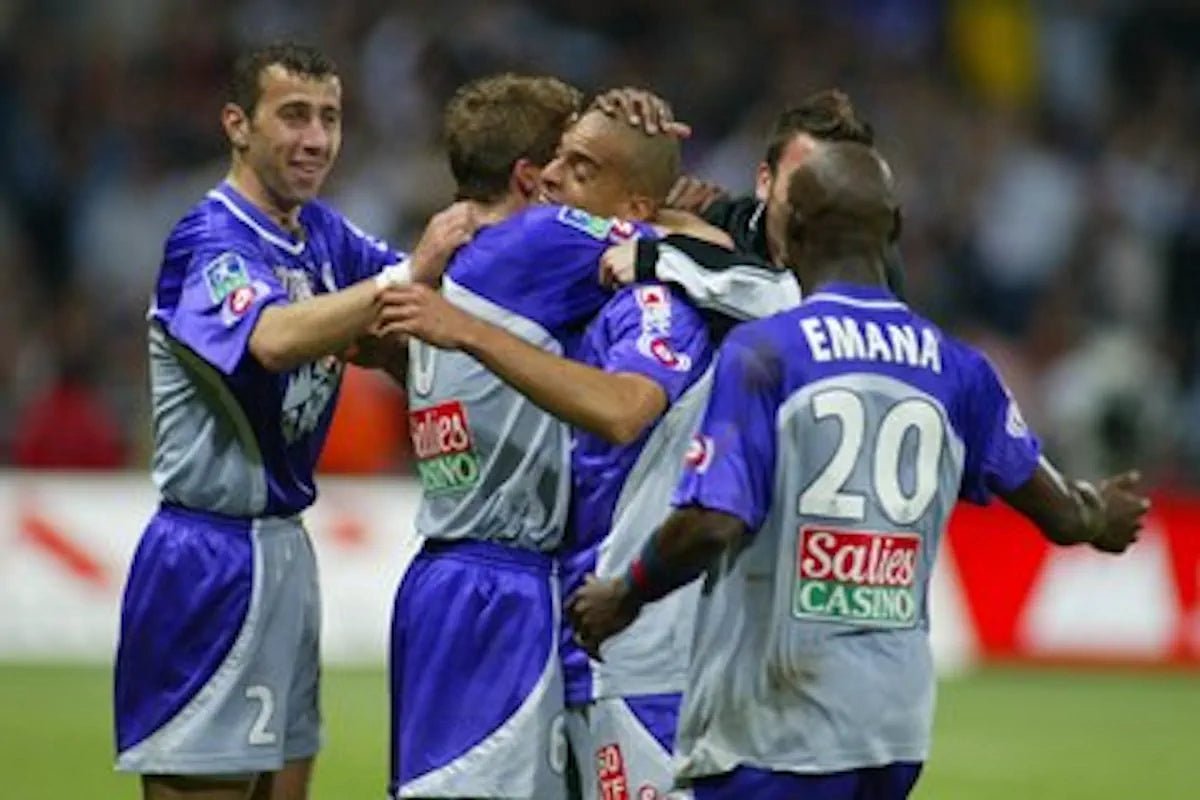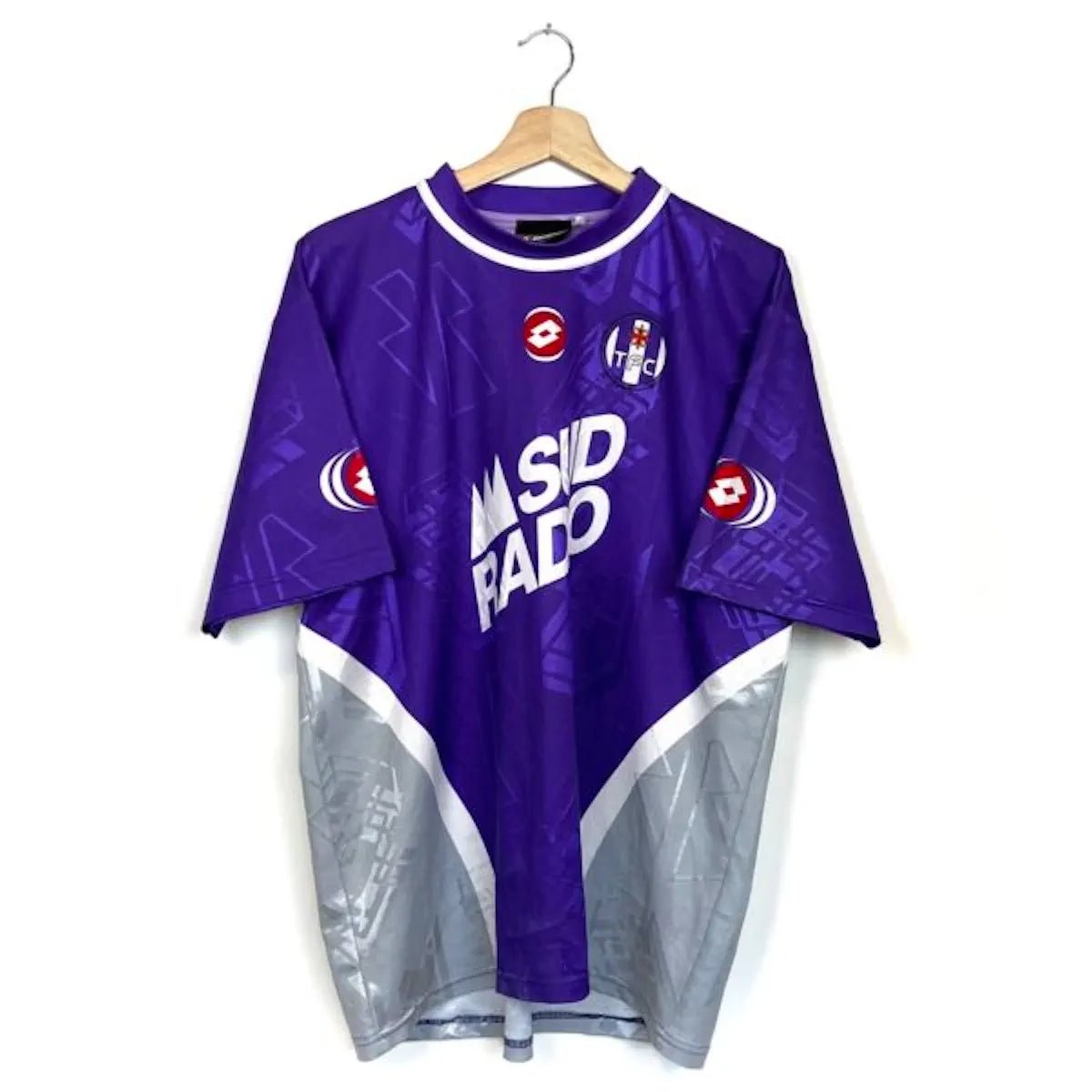 Note IFS : 7/10 - Bon état général, beaucoup de bouloches et 2-3 petits trous sont à noter sur ce rare maillot de Toulouse. L'écusson et les logos Lotto sont incrustés dans le textile.