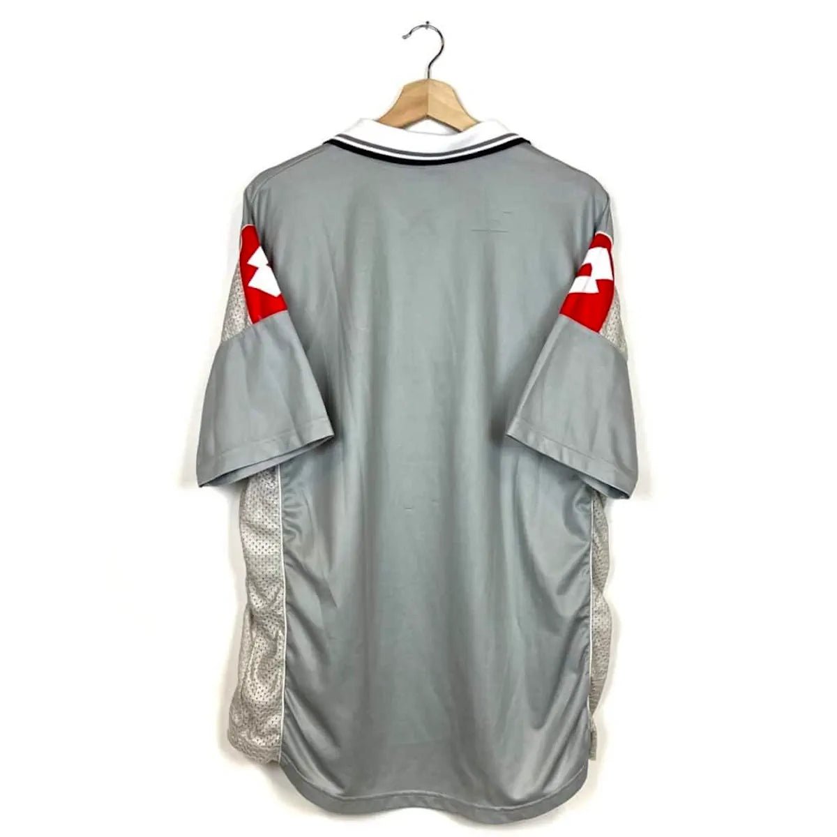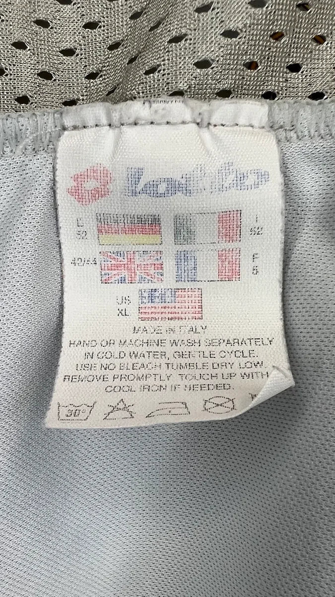 Note IFS : 7/10 - Bon état malgré de nombreuses bouloches et fils tirés (d'où le prix réduit, normalement plus de 100€ pour ce maillot très rare en excellent état). L'écusson du club est brodé, les autres éléments tels que le sponsor et les logos Lotto sont incrustés dans le textile. Belle pièce pour la collection ou taper un foot ! On pense à Zizou et Del Piero forcément.