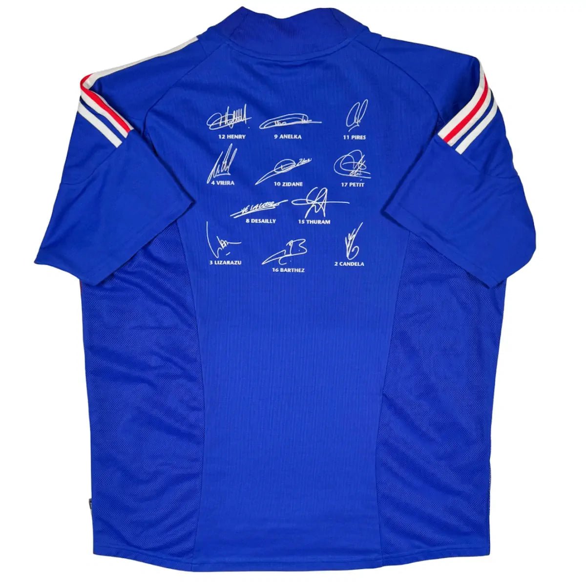 Note IFS : 9/10 – Maillot rétro de l’équipe de France période 2002-2004 avec les signatures des joueurs imprimées directement sur le maillot, une version collector dérivée du modèle de 2002. Design iconique, détail graphique fort et pièce pensée pour les collectionneurs, avec un rendu original qui se distingue clairement des versions classiques.