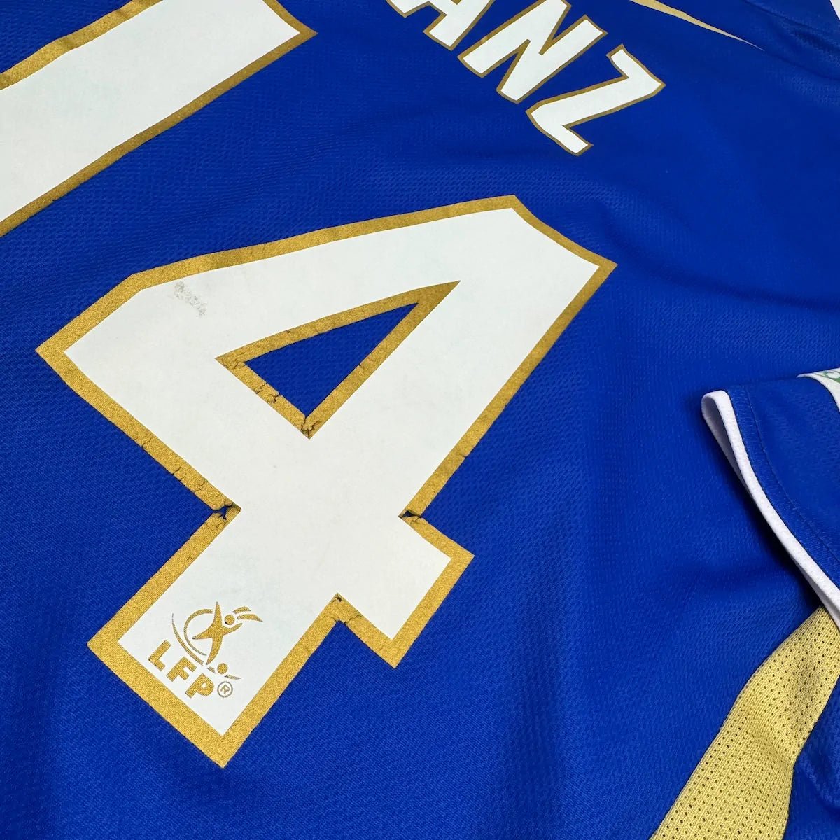 Note IFS : 9/10 - Maillot domicile de l’ESTAC préparé et/ou porté par Gaël Sanz, une vraie pièce à l’ancienne avec le sponsor principal directement sublimé dans le tissu. Le flocage dorsal présente une légère usure sur les chiffres, mais le nom est impeccable. Patch officiel de la Ligue 2 sur la manche. Modèle original et typiquement français. Gaël Sanz, joueur fidèle au club entre 2002 et 2011 après des passages au LOSC et à Beauvais. Un maillot rare et collector pour les amateurs de foot hexagonal.